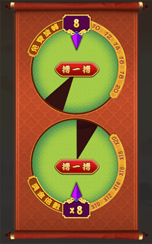 如果進入到免費遊戲後,聚寶財神是採用搏一搏輪盤,第一盤成功再增加兩場免費遊戲,第二次在成功後,獎金倍數再乘上 2!當然如果某個轉盤失敗後,免費遊戲機制將會結束。