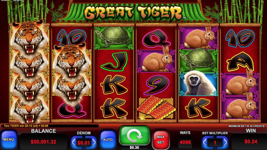 以動物為主題的老虎機遊戲在在線遊戲領域並不新鮮,但 Great Tiger 以野生動物符號為特色,輔以亞洲風格的主題。這款佈滿竹子的老虎機遊戲由 Everi Gaming 設計,該品牌以其鮮豔的色彩和誇張的圖案而聞名。
