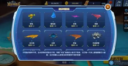 - 掛機系統:可選擇想捕獲的魚或勾選道具魚種,系統會優先隨機攻擊場中的道具魚。
